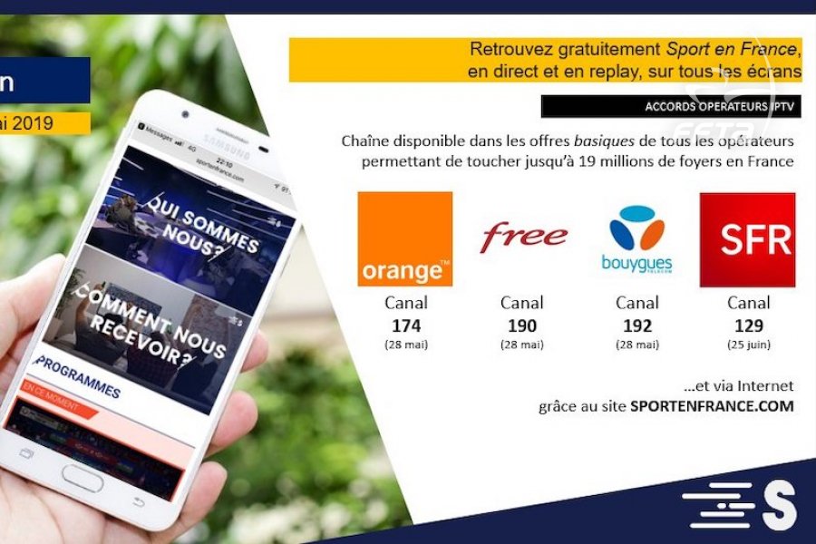Les contenus produits pourront être repris par les médias qui en feront la demande. La chaîne est accessible en direct et en replay sur les box opérateurs : Orange (174), Free (190), Bouygues (192) dès aujourd’hui et SFR (129) à partir du 25 juin. Vous pourrez également y accéder via le site dédié, www.sportenfrance.com.